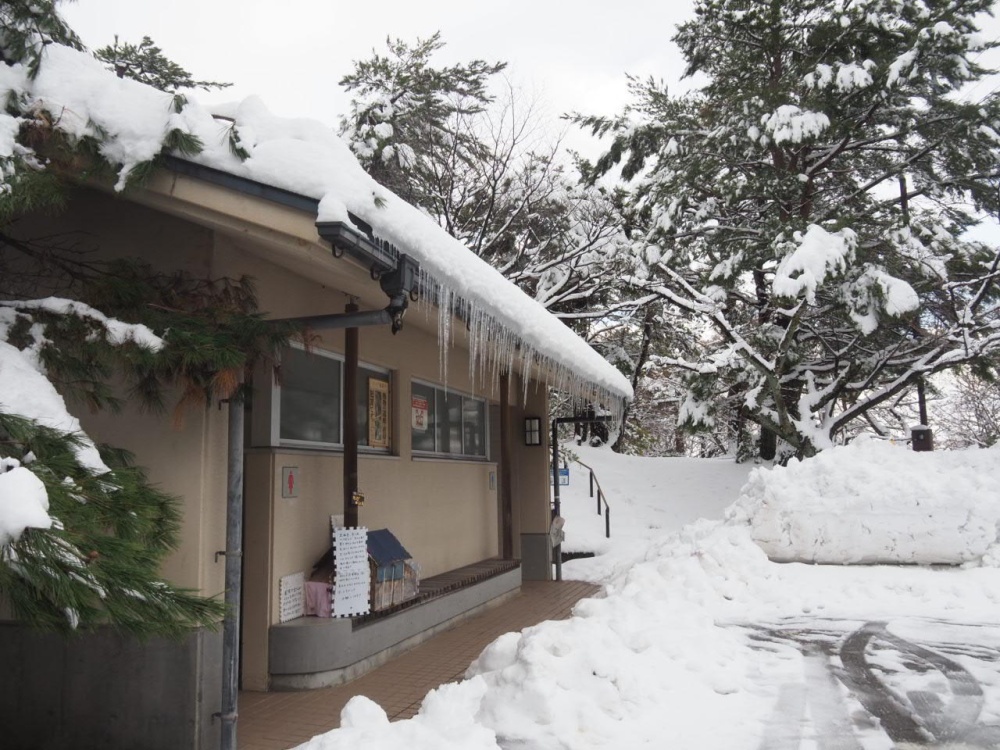 駐車場のトイレには、巨大な氷柱が下がっていました。