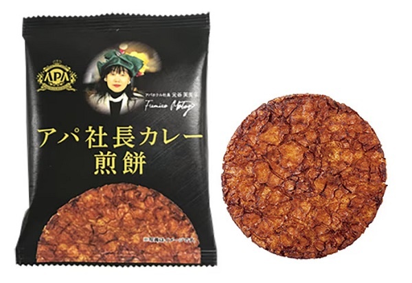 そして新発売のアパ社長カレー煎餅。大判サイズで、どこを食べても均一なカレー味。駄菓子のカレーせんべいよりもスパイスは高級感あり。ライス、うどん、煎餅それぞれにカレーの味が変化するのも興味深い。今後新たなコラボ商品も企画されそうな感じ。