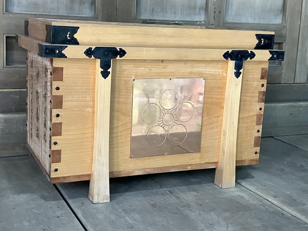前田家の家紋 剣梅鉢紋がついた賽銭箱