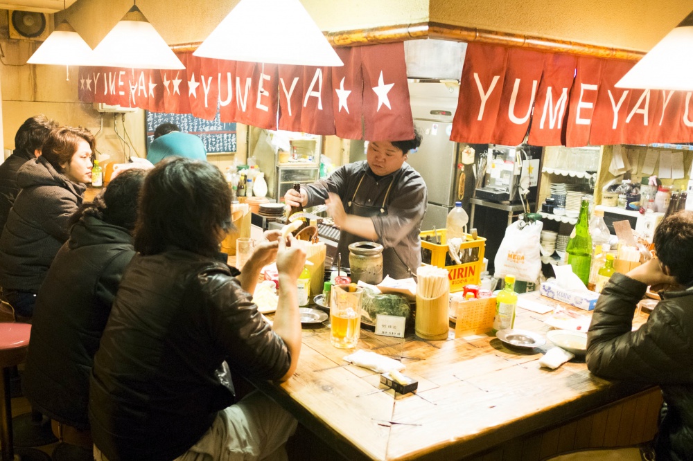 平和町交差点のT字路を、泉野方面に進むと左に見えてくる「やきとり」の赤ちょうちん(赤看板)。焼き鳥の老舗「夢や」です。店主は魚屋出身で、カワハギや甘エビなど、海の幸も味わえる珍しいお店ですが、やっぱり一番は焼き鳥!カリッとジューシーな串をほおばりながら、冷たいビールをグビッとやれば、寒さも吹き飛びますよ!